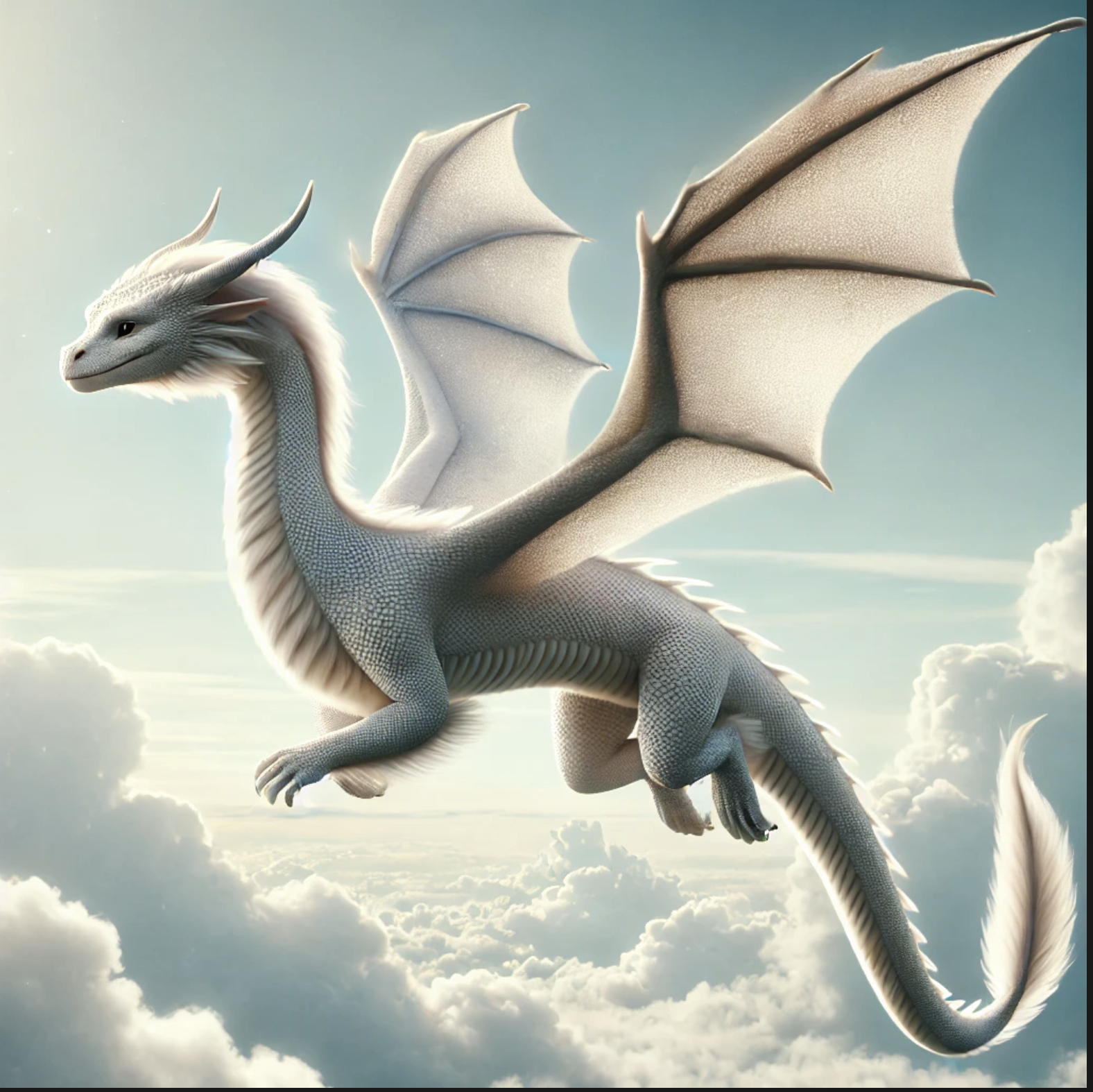 Wie wäre es mit einem majestätischen weißen Drachen, der durch die Lüfte schwebt, mit schimmernden Schuppen, einem langen, eleganten Körper und einem freundlichen Gesicht? Vielleicht könnte er auch weiche, fellartige Details haben, um das freundliche Aussehen zu betonen. Soll ich dir ein solches Bild erstellen?