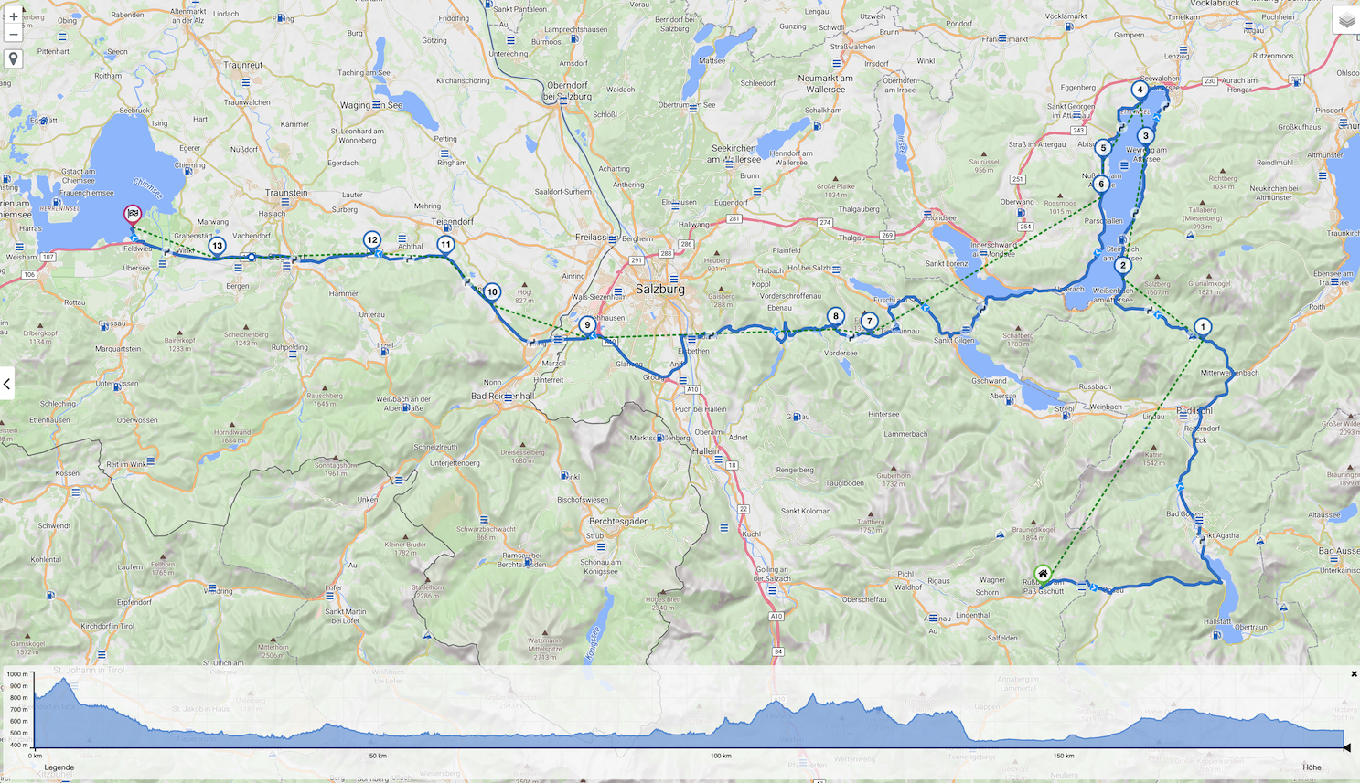 Am Tag 8 sind wir vom Pass Gschütt wieder Richtung Bad Goisern gefahren. Wir haben den Attersee umrundet und sind am Mondsee vorbeigefahren.. Bei dieser Fahrt machte sich mein ABS System mit einer roten Lampe bemerkbar. Ich habe es auch ausprobiert und mit dem Hinterrad eine Vollbremsung gemacht. Tatsächlich hat der Reifen beim Bremsen geschmiert und ist seitlich weggerutscht. Einen Sturz konnte ich durch loslassen vermeiden. Also fahre ich die restlichen Kilomter mit vorsichtigen Bremsen. Salzburg haben wir großräumig umfahren. Unser Ziel den Chiemsee haben wir erreicht.