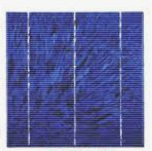 Polykristalline Siliziumzellen: Polykristalline Zellen haben eine Wirkungsgrad von ca. 18%. Die Oberfläche ist nicht gleichmäßig. Man kann die kristalline Struktur gut erkennen. |