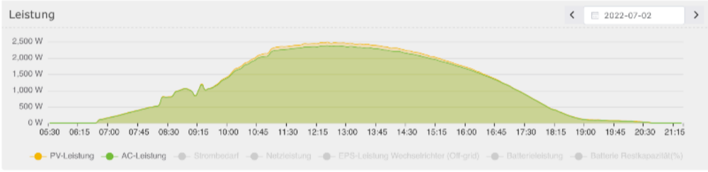 Ideale Sonneneinstrahlung an einem Tag im Juli. Der nicht ideale Ertrag an der ansteigenden Flanke ist durch die Topologie und durch Verschattungen auf dem Flachdach verursacht.
