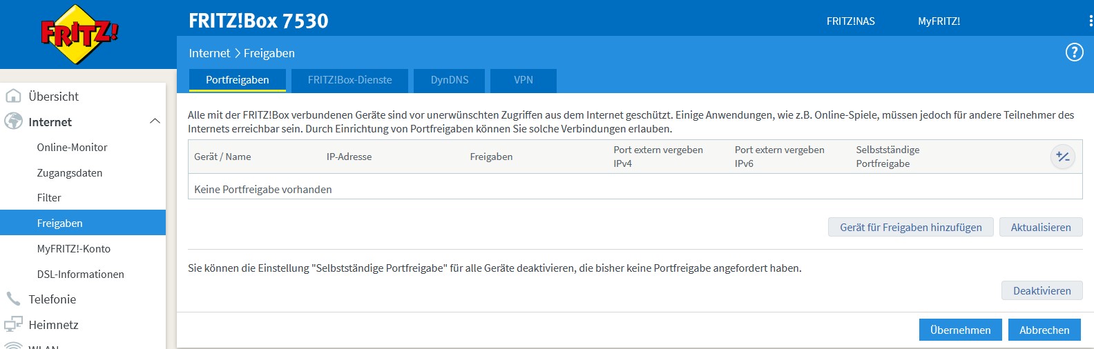 6.) Die Buttons Übernehmen und Aktuallisieren beätigen. Dann sollten die Freigaben grün sein.