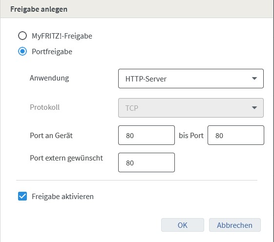 5.) Die zweite Portfreigabe heißt HTTP Server mit dem Port 80.