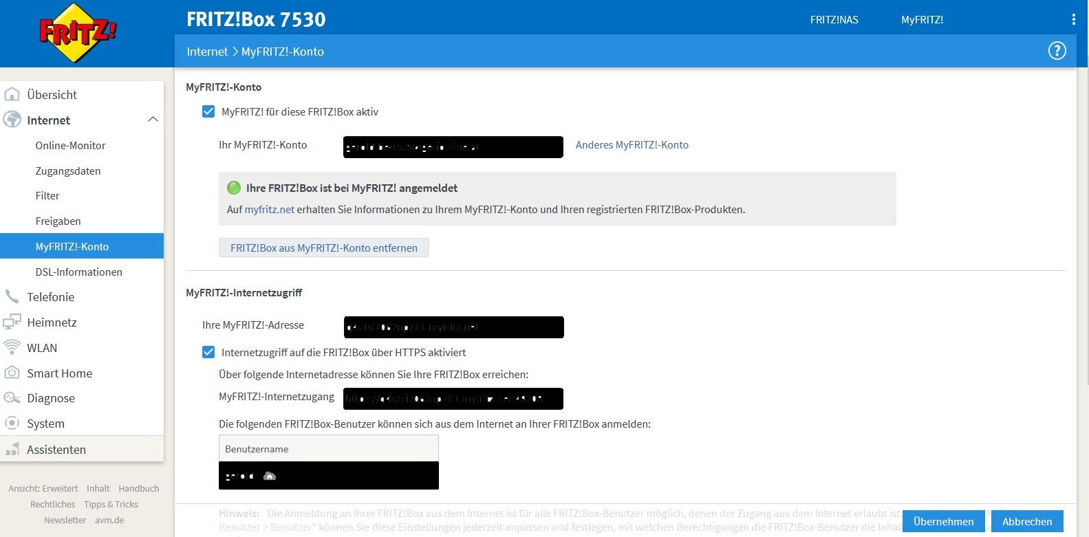 Die Fritzbox ist über einen Browser mit der Adresse fritz.box aufzurufen. Nach dem Anmelden über den Punkt Internet ⇒ MyFRITZ! Konto die Eingabemaske aufrufen. Bei der Registrierung muss der Fritzboxkontoname eingegeben werden. Üblicherweise ist es die Emailadresse. Unter den Punkten Ihre MyFRITZ!-Adresse stellt die Fritzbox eine Aufrufadresse zur Verfügung, über die auf die Logo dann zugegriffen werden kann. Der MyFRITZ!-Internetzugang ist einen Adresse, bei der von Außen für die Administration auf den Router zugegriffen werden kann. Es muss dafür noch ein Nutzer angelegt werden.