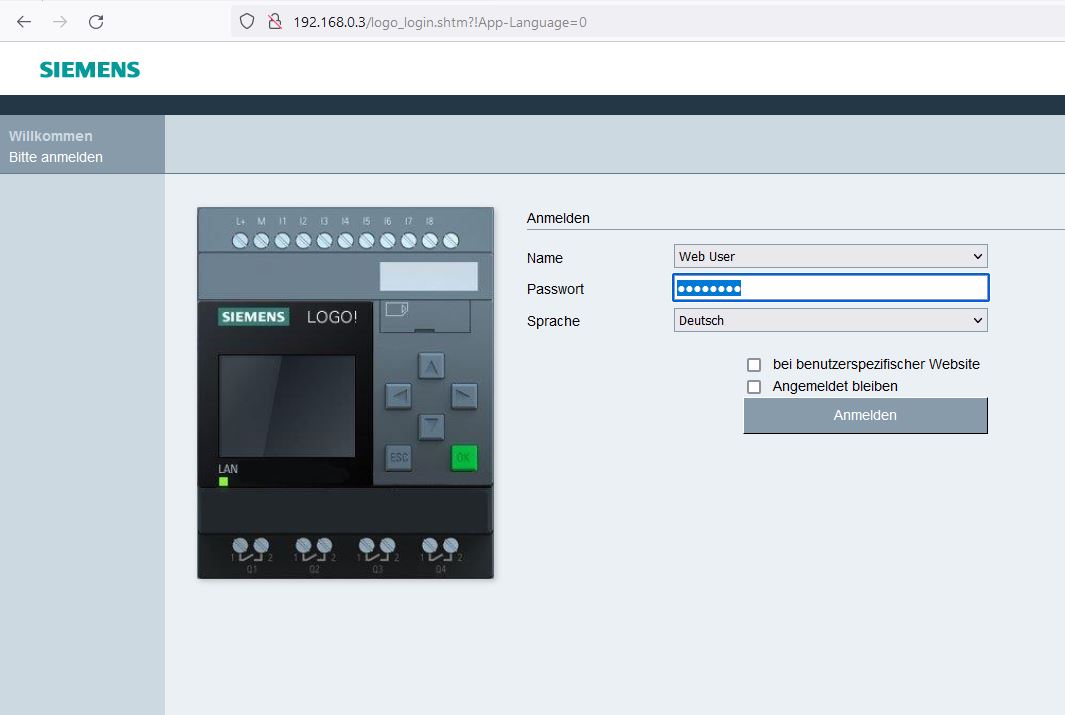 Der Browser öffnet sich. Der Webuser ist schon voreingestellt. Das Passwort eingeben. Die Sprache auf Deutsch stellen. Es gibt dann vier Möglichkeiten.