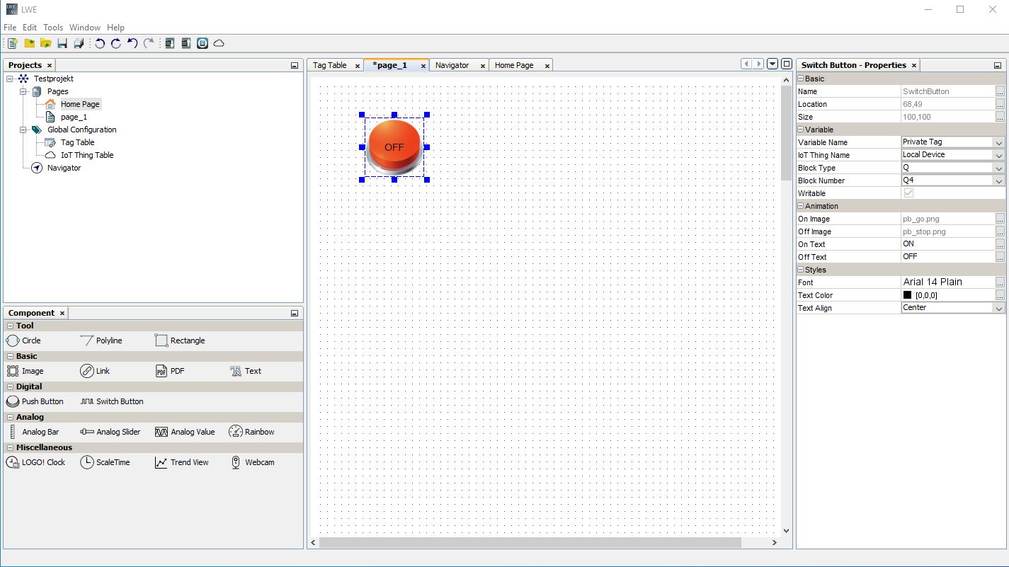 Digital Push Button , Taster klick bildet beim Loslassen einen Impuls, Taster mit hold schaltet so lange wie gedrückt wird. Es ist zu beachten, dass der Taster nicht als Eingang verwendet werden darf. Eingänge können nicht geschrieben werden. Switch Button ist eine Fläche die Als Taster oder zur Signalisierung verwendet werden kann. Wenn nötig den Hacken beschreibbar anklicken. Für Statuswerte können unterschiedliche Farben verwendet werden.